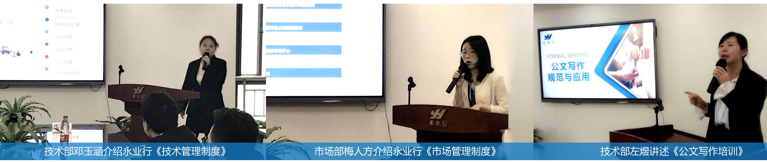 公司職能部門分別就《技術(shù)管理制度》《市場管理制度》《公文寫作》向新員工進行培訓(xùn)。