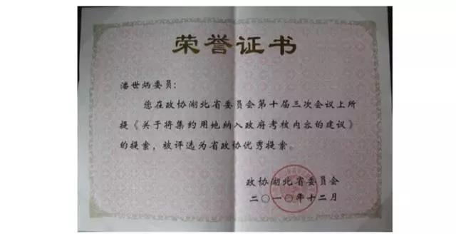 2008年1月,潘世炳參加了政協(xié)湖北省第十屆委員會(huì)第一次會(huì)議,首次參政議政,潘世炳就提交了5個(gè)提案。其中,他提出的房產(chǎn)證、土地證“兩證合一”方案,和老百姓關(guān)系最為密切,“把房地產(chǎn)所有權(quán)證和土地使用權(quán)證合在一起,發(fā)一個(gè)房地產(chǎn)證。當(dāng)時(shí)提案提了以后,主辦方很重視,搞試點(diǎn),不斷推廣不斷完善,再過(guò)了7、8年以后就全部發(fā)證了。老百姓辦證很方便,就不用跑兩個(gè)部門(mén),也不用花兩道費(fèi)。”