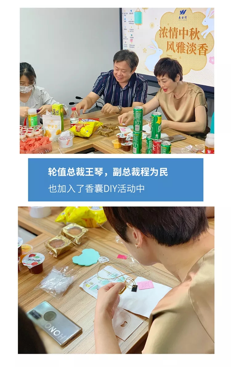 為弘揚(yáng)中華傳統(tǒng)文化,營(yíng)造濃厚的節(jié)日氛圍,2021年9月17日,永業(yè)行總部舉辦“濃情中秋 風(fēng)雅淡香”香囊DIY活動(dòng),水岸國(guó)際、綠地銘創(chuàng)、匠心城等三個(gè)辦公區(qū)的小伙伴踴躍報(bào)名,積極參加了當(dāng)天的活動(dòng),用香氣怡人的香囊迎接中秋節(jié)的到來(lái)。