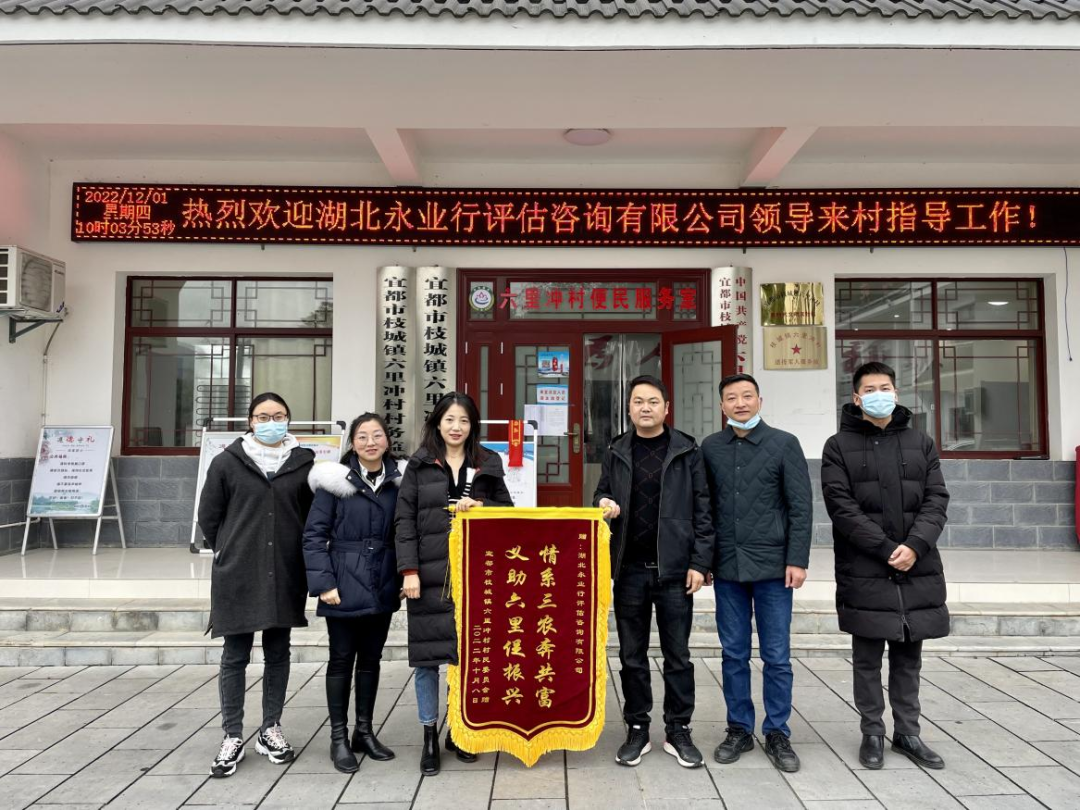 (宜昌市駐六里沖村工作隊第一書記、隊長徐兵,六里沖村黨總支部書記、村委會主任黃華耘等向永業(yè)行贈送錦旗,永業(yè)行投資咨詢事業(yè)群西南區(qū)域負(fù)責(zé)人兼全過程咨詢事業(yè)部總經(jīng)理楊鳳、西南區(qū)域副總監(jiān)高海曼等接受頒贈)